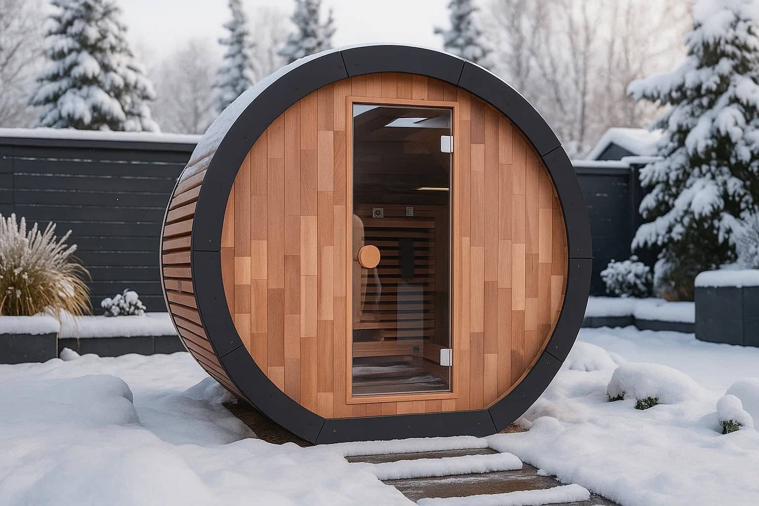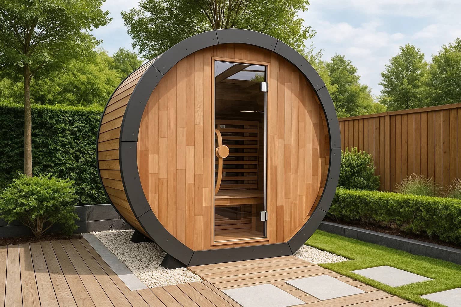 Czerwony cedr to idealny wybór do saun zewnętrznych dzięki swojej naturalnej trwałości i właściwościom izolacyjnym. Drewno jest odporne na wilgoć, pleśń i wahania temperatury, a jego ciepły aromat i przyjemna powierzchnia sprzyjają dobremu samopoczuciu. Sauna beczkowa jest również w całości pokryta dachem z EPDM, dzięki czemu praktycznie nie wymaga konserwacji i zapewnia wieloletnią ochronę przed warunkami atmosferycznymi.